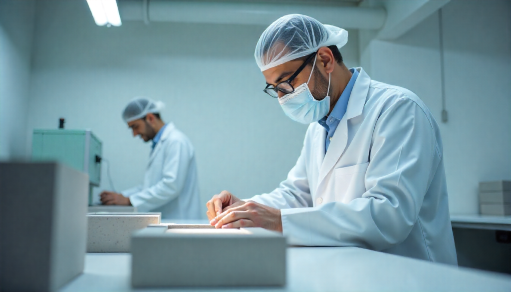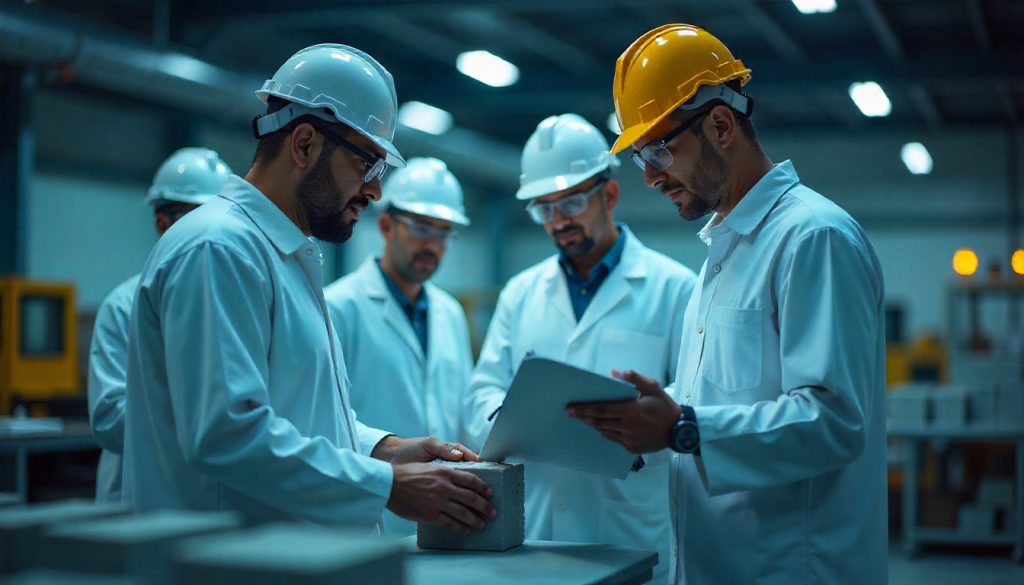 فحص البلوك والبلاط والبردورات باختبارات إتلافية وغير إتلافية لضمان الجودة.